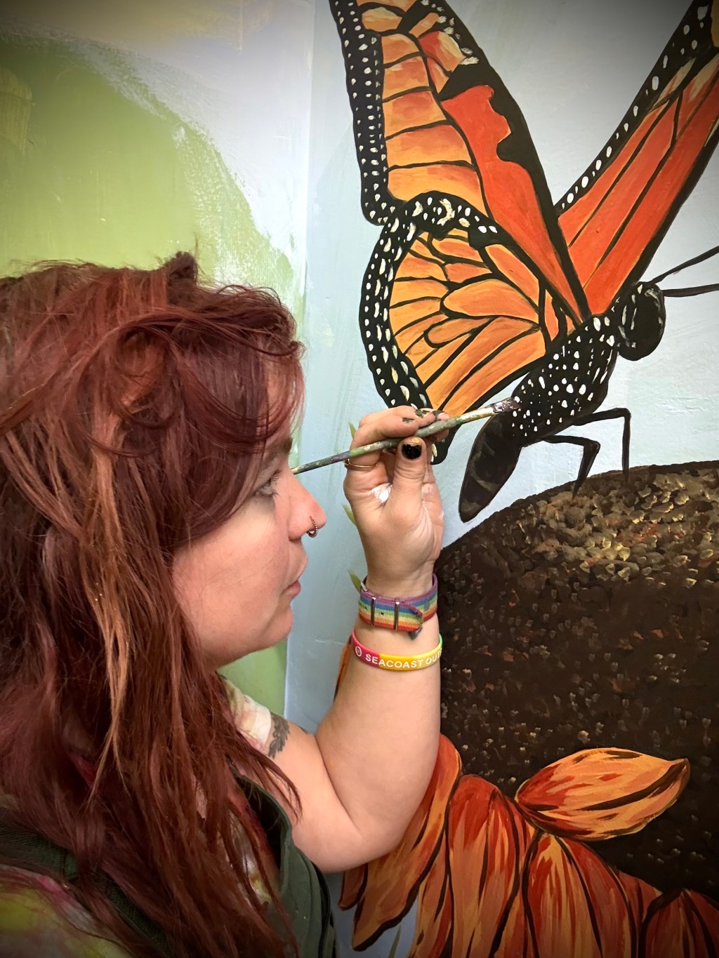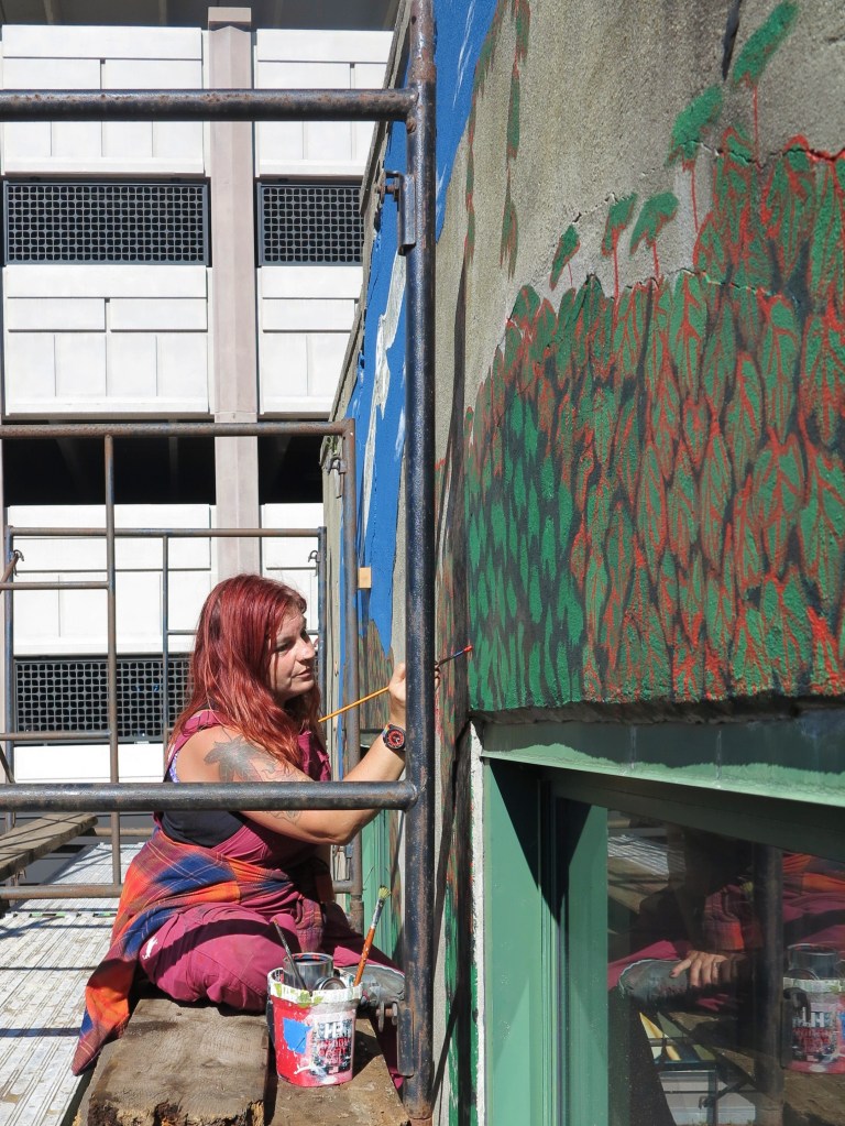 Kris Ringman (they/she) is a Deaf queer artist and author inspired by nature, animals, and world mythology. Kris is obsessed with the intersection of wildlife and human—the ways that all of us must learn to shapeshift in response to the challenges we face throughout our lives. Kris welcomes any way their artwork can be a source of activism for environmental protection, climate change, and diversity advocacy. Kris strives to incorporate De’VIA (Deaf View/Image Art) into their work whenever possible and are excited to paint murals featuring ASL signs in addition to endangered and local wildlife, botanical illustrations with poetry, and native plants with their pollinators. Their murals showcase an expressive, illustrative style with folk and fantasy elements. In addition to murals, they do smaller paintings on wood panels as well as craft their own rune sets and amulets. Kris is also the author of two Lambda Literary finalist books, MAKARA: a novel, I Stole You: Stories from the Fae, and a poetry collection, Sail Skin: poems. When not painting or writing, they can be found wandering up mountains or across the sea.