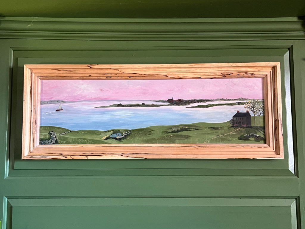 One client wished for his house to be painted in a Rufus Porter style painting with a view of the Piscataqua River and the city of Portsmouth, NH, in the background. The green shade of the foreground and the pinks in the sky were supplied to the artist as guides so that the color scheme of the painting could match the walls in the room he planned to hang the painting.