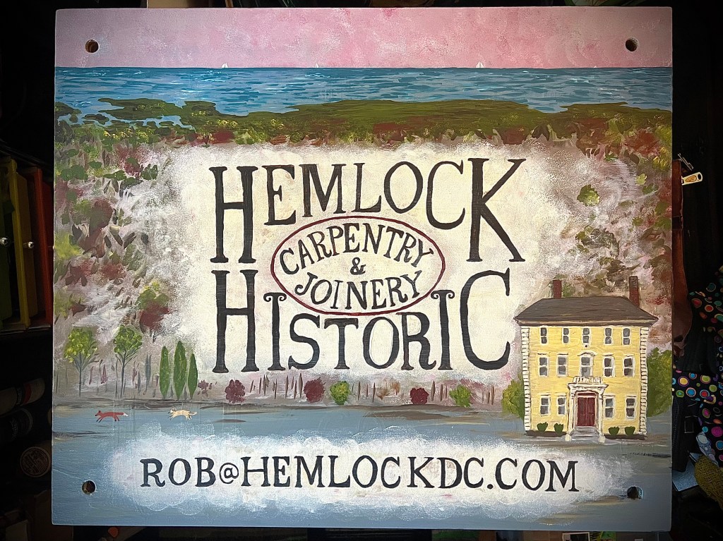 This sign was painted in Rufus Porter style for Hemlock Historic Carpentry and Joinery. For lettering, we offer custom freehand lettering, which gives a classic feel to signs and murals: