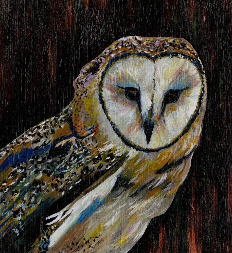 Barn Owl, 16″x20″ acrylic painting on wood panel, 2019: