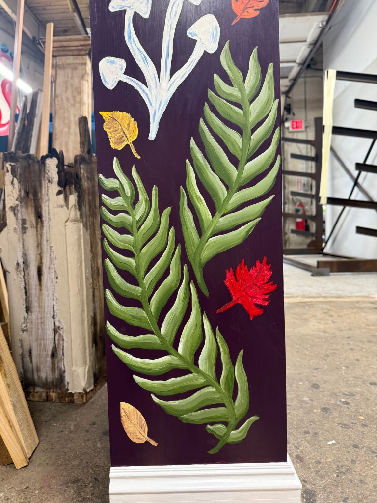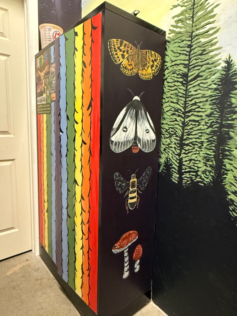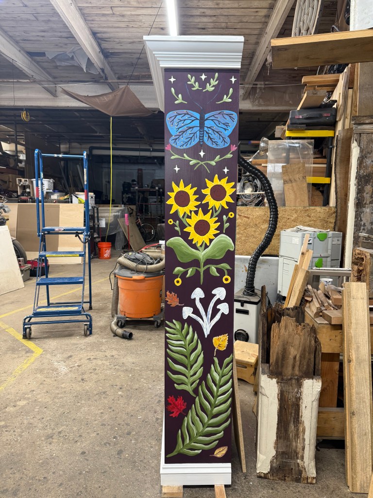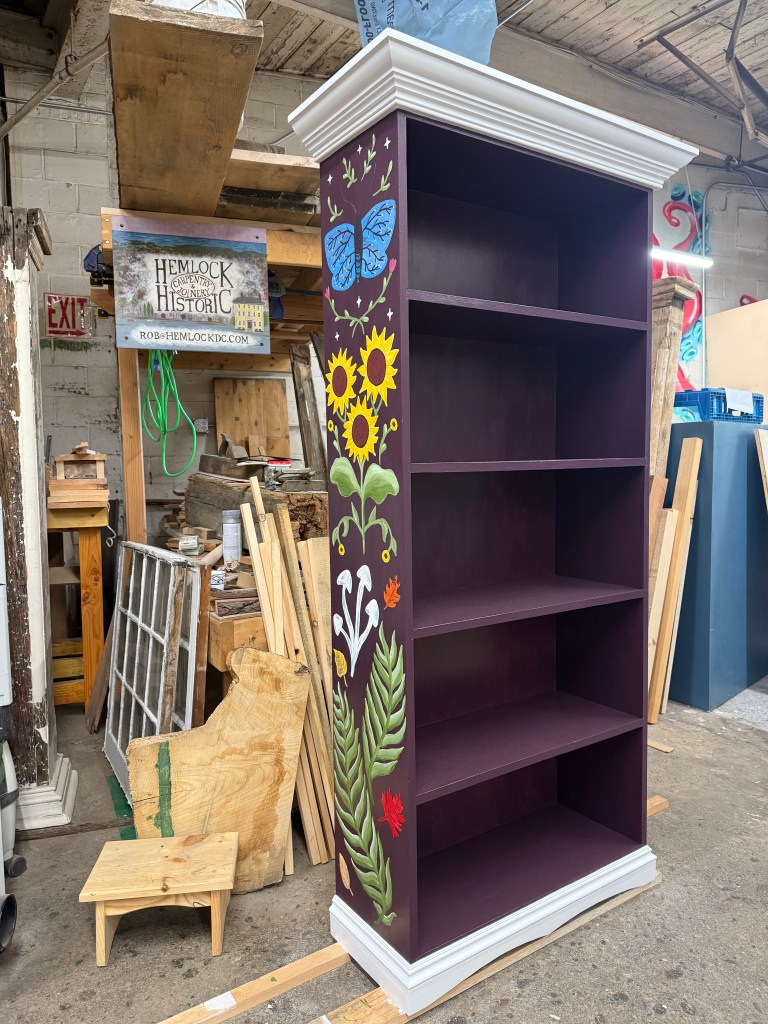 Bookshelf with a custom moulding added to the top and floral folk designs on the sides: