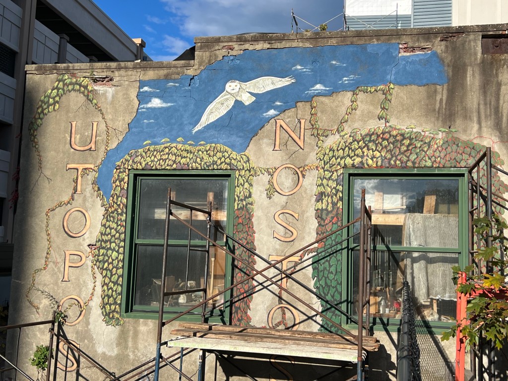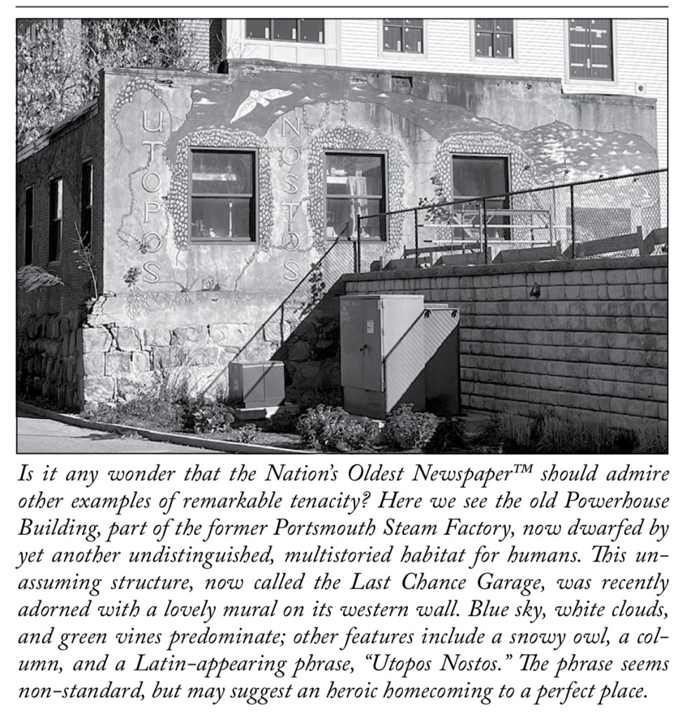 The words UTOPOS NOSTOS are Greek words that mean “no place/a perfect place” and “returning home/nostalgia.” These words were chosen from Dave’s ancestral heritage to convey the sense that we as humans are perpetually longing for a perfect place, but that place doesn’t exist, just as there is no true “perfection” able to be achieved through historical preservation either. However, there is beauty in the reaching for this unachievable state, and our attempts at perfection, from the construction of Greek architecture to the Portsmouth Gundalow, are worthy of our awe and our continuous efforts.