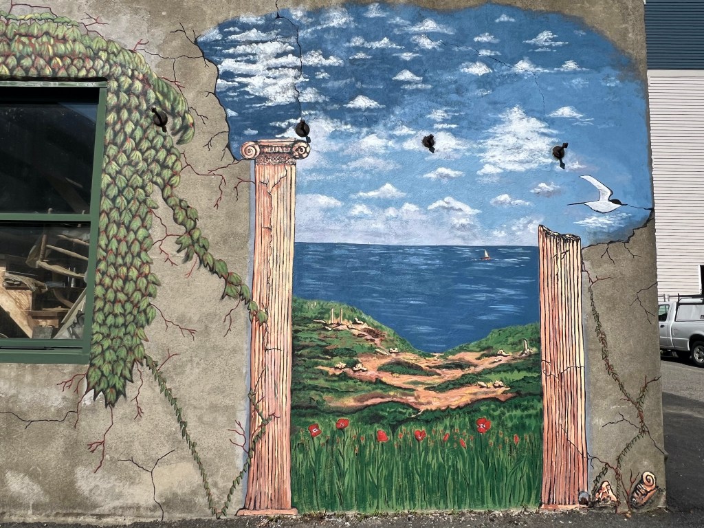 This 450 square foot mural was painted on concrete on and meant to add a voice to a small building, The Last Chance Garage, currently surrounded by intense neighborhood construction. The building’s owner, Dave Adams, traces his ancestry back to Greece and is a retired historical carpenter, so it features crumbling Greek columns with a view of the sea between them and includes the historic Portsmouth Gundalow ship sailing in the distance.
