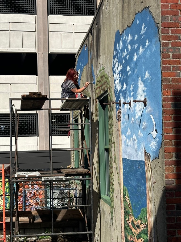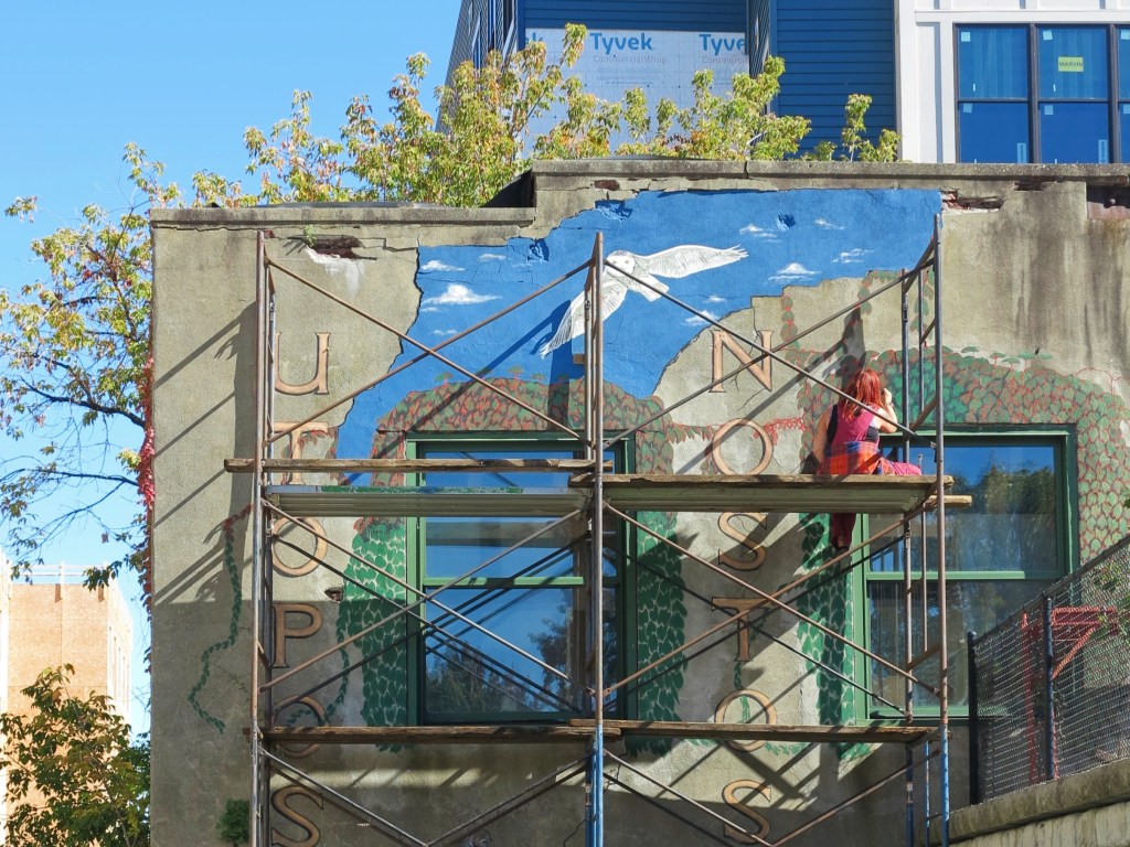 Here’s the mural at about 80% completion. Scaffolding was used for the artist to reach each side of the building.